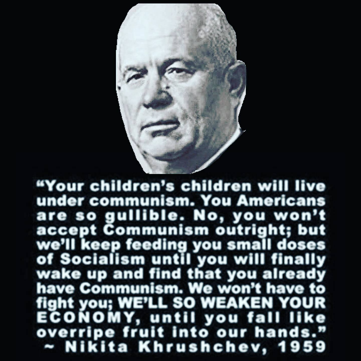 I'll also include a quote from Kruschev warning we Americans are so gullible we'll end up with communism without even knowing it's happening - without even knowing we're under attack: "Your children’s children will live under communism. You Americans are so gullible. No, you won’t accept Communism outright, but we’ll keep feeding you small doses of Socialism until you will finally wake up and find that you already have Communism. We won’t have to fight you; We’ll so weaken your economy, until you fall like overripe fruit into our hands."