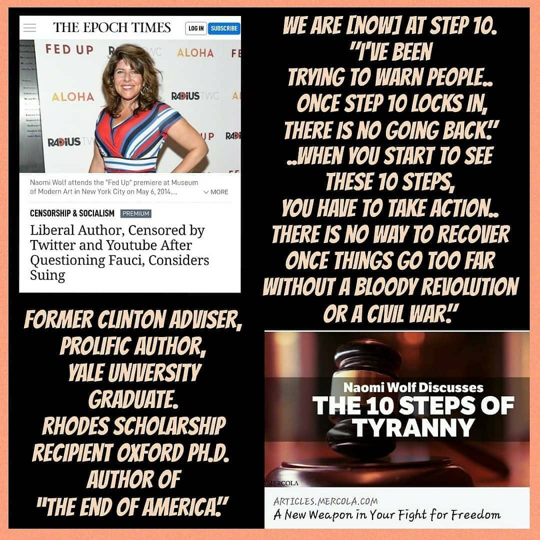 Naomi Wolf, a former adviser to the Clinton administration, is a prolific author and Yale University graduate. She also received a prestigious Rhodes Scholarship that allowed her to complete her Ph.D. in English and literature at University of Oxford in 2015. Naomi, like many others with notoriety and large followings, has been banned on Twitter for speaking out in protest of the highly fraudulent mainstream narrative threatening the future of civilization. In 2007, she wrote a book called 'The End of America". Quoting Naomi today: ”...We are [now] at Step 10. "I've been trying to warn people, tirelessly, as much as I can, that we are at Step 10 and that once Step 10 locks in, there is no going back." In “The End of America,” Wolf lays out the 10 steps toward tyranny. These steps have been followed by virtually all would-be tyrants, be they on the political left or right. They were followed in Italy in the '20s, Germany in '30s, East Germany in the '50s, Chile in the '70s and China in the '80s. “They all took the same 10 steps, and they always work,” Wolf says. “I warned people that when you start to see these 10 steps, you have to take action, because there is no way to recover once things go too far without a bloody revolution or a civil war."